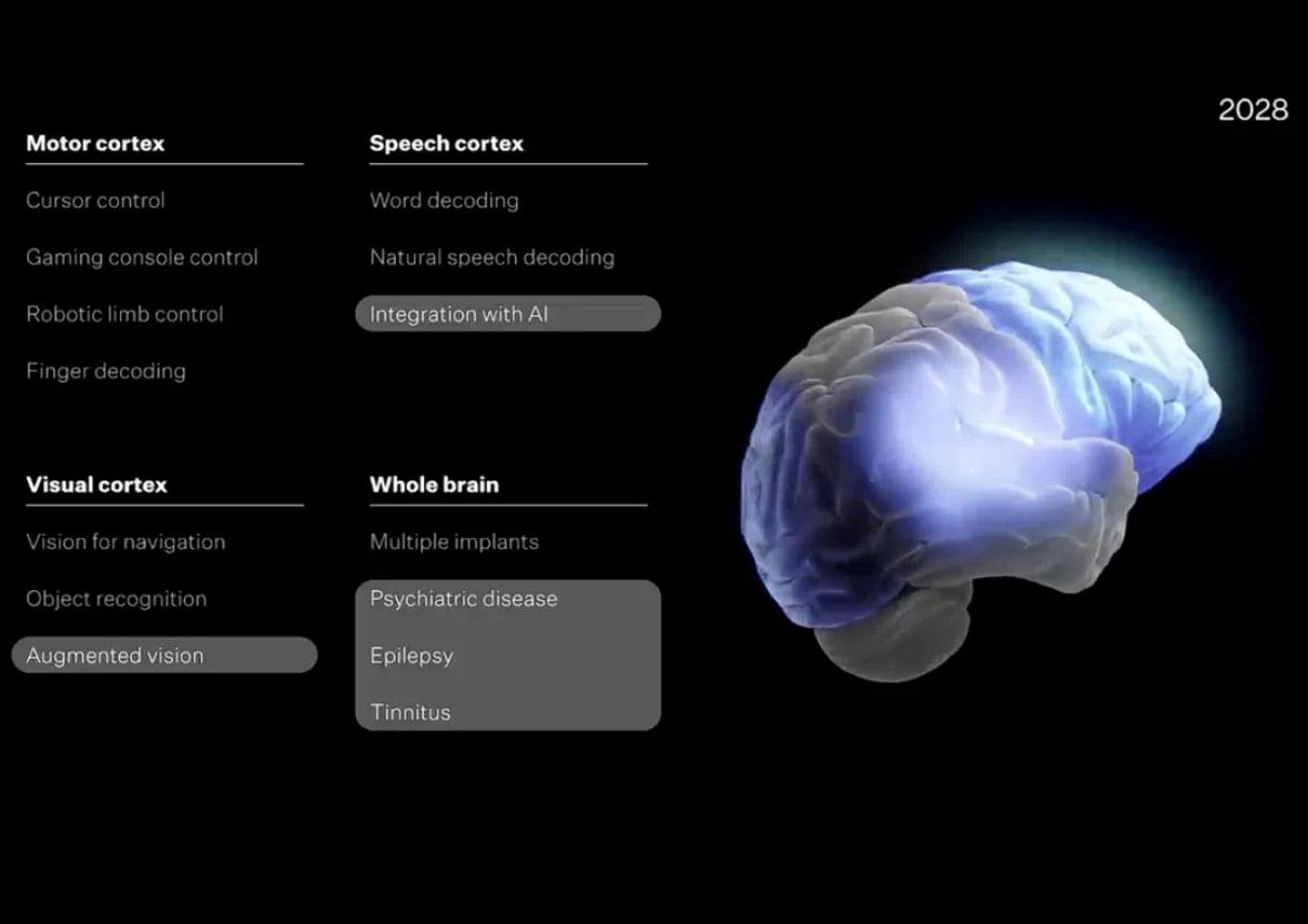 根據(jù)Neuralink發(fā)布的“三年路線圖”,他們將在2025年第四季度實(shí)現(xiàn)言語皮層設(shè)備植入,直接從大腦信號中解碼詞語并轉(zhuǎn)換為語音;2026年則將電極數(shù)量提升至3000個,使首位盲視參與者恢復(fù)視覺,嘗試達(dá)到超人級別的多波段視覺;2027年,通道數(shù)將進(jìn)一步增至10000個,首次實(shí)現(xiàn)多設(shè)備植入,覆蓋運(yùn)動、言語和視覺皮層;到2028年,每個植入接口將擁有超過25000個通道,能夠訪問大腦的任何部分,可治療精神疾病、疼痛和其他失調(diào)狀態(tài),甚至更驚人的——讓人類與AI集成。