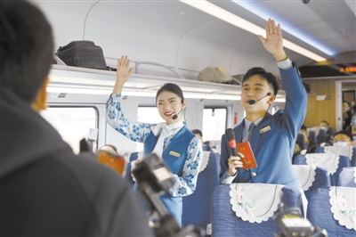 中老鐵路試乘體驗采訪活動中,列車員與乘客們互動。人民視覺供圖