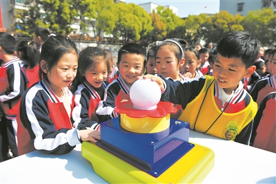 “科普大篷車”進(jìn)校園,湖北宜昌秭歸縣實驗小學(xué)學(xué)生體驗科普設(shè)備“輝光球”。視覺中國供圖
