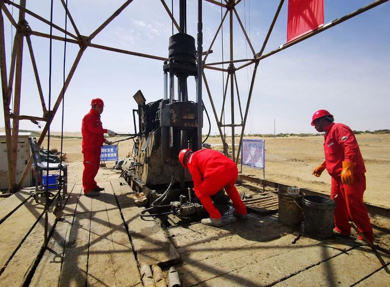 塔克拉瑪干沙漠里,科研人員操作大型環境鉆探機鉆取巖芯。謝震霖 攝