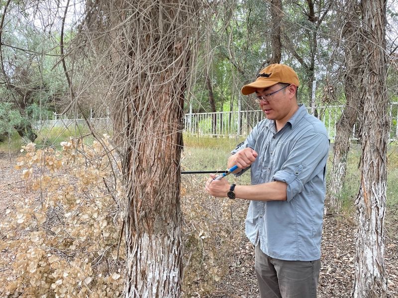 在天山北坡經濟帶片區,第三次新疆科考“天山北坡土地開發調查與生態環境效應評估”項目負責人、中國科學院地理科學與資源研究所研究員賈小旭正帶領團隊給樹木“體檢”,用T字形工具取出樹芯,觀察其健康狀況,從而評估防護林整體情況。