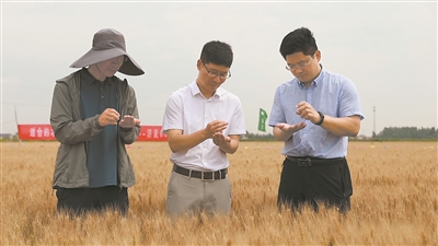 山東省農科院作物所小麥育種專家在東營墾利進行抗旱耐鹽堿小麥濟麥60測產驗收。受訪者供圖