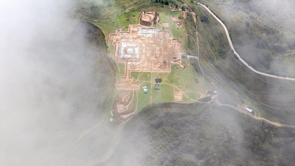 四角坪遺址位于甘肅禮縣縣城東北約2.5公里處的四格子山頂部。整個遺址坐落于人工“削平”的山頂平臺之上,結構清晰、氣勢恢宏。中心是一座面積約900平方米的方形夯土臺,東西南北四向各分布三組平行的門塾建筑,四角則建有曲尺形建筑,共同構成一組建筑面積約2萬平方米的中心對稱建筑群。這個罕見的規模宏大、格局規整的秦代大型禮制性建筑群,是國家祭祀變革與中國“大一統”歷史進程的物化載體。