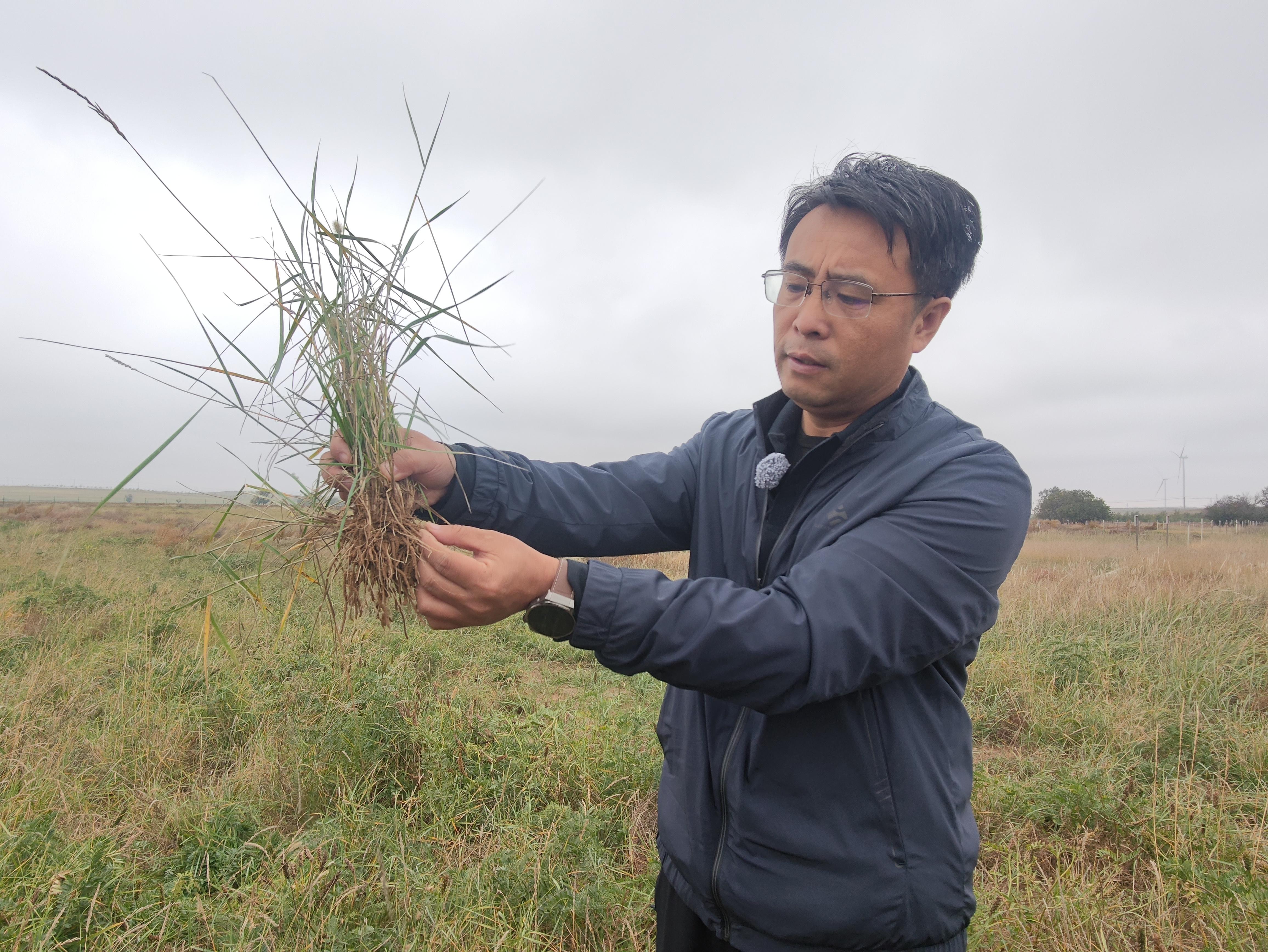 “這是我們?nèi)靠刻烊唤涤暄a(bǔ)播的草場(chǎng),已經(jīng)形成了一個(gè)穩(wěn)定群落,明年打算進(jìn)行適度放牧試驗(yàn)!”10月20日,站在齊膝深的草場(chǎng),寧夏農(nóng)林科學(xué)院林業(yè)與草地生態(tài)研究所所長(zhǎng)王占軍臉上綻開笑容。