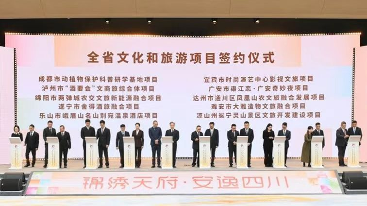 自四川省委十二屆七次全會以來,四川省形成了“重文旅、抓文旅、興文旅”的生動局面,一批高質量項目加速落地。本次大會共有114個重大文旅項目集中簽約,總金額達567.96億元,其中10個代表性項目現場簽約,金額達135.4億元。同時,為進一步擴大合作機遇,大會現場還發布了《2025年四川省文化和旅游重點招商項目指南》,圍繞數字文化、演藝娛樂、休閑度假等十大重點領域,推出480個前景廣闊、回報可期的優質項目,招商總金額高達5700億元。