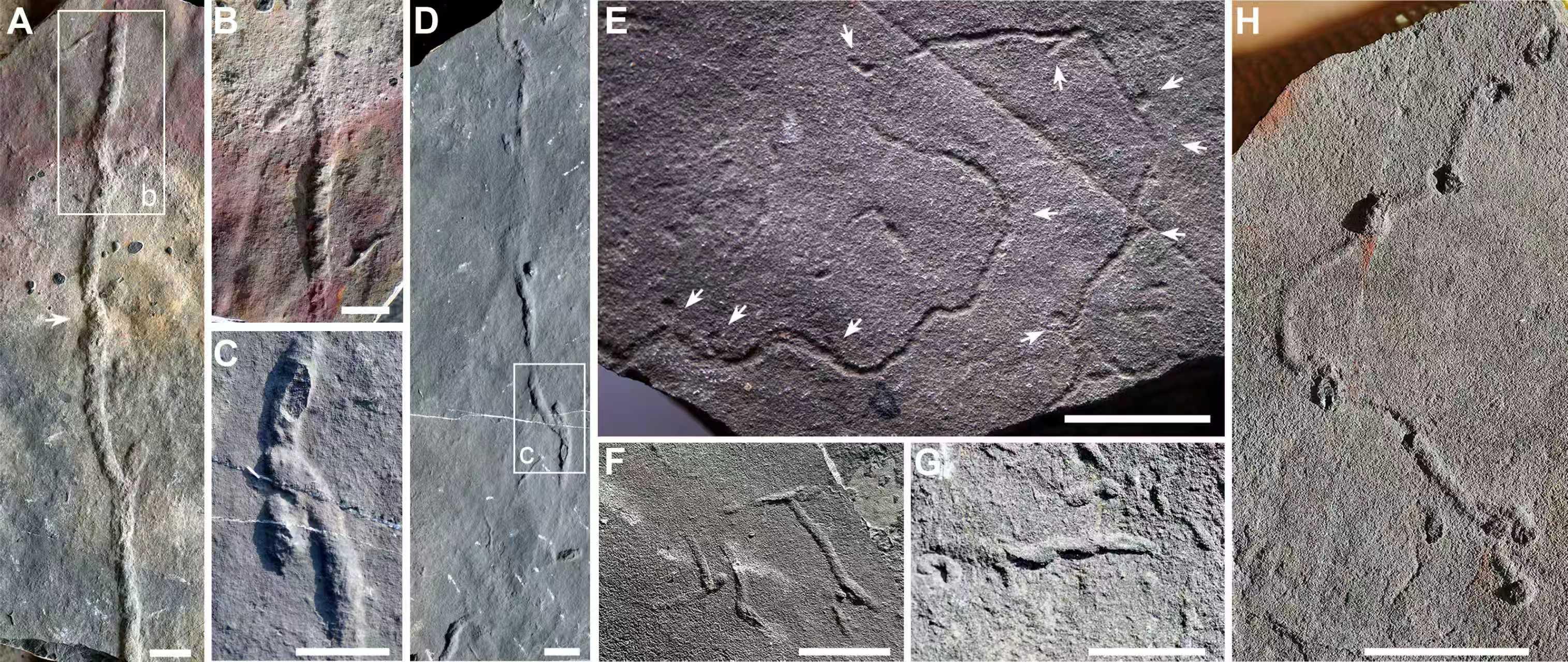據(jù)南京古生物所研究員陳哲介紹,在對湖北宜昌“石板灘生物群”(距今約5.5億—5.43億年)遺跡化石的研究中,他們發(fā)現(xiàn)鋸形跡屬中的多個遺跡化石種,并建立一個新遺跡化石種。鋸形跡被視為動物首次向沉積物內部進行“三維探索”的標志性遺跡,具有重要的演化生物學、動物行為學和生態(tài)學意義。與此同時,石板灘生物群中還保存了多山跡及蝌蚪狀遺跡化石等三維潛穴。